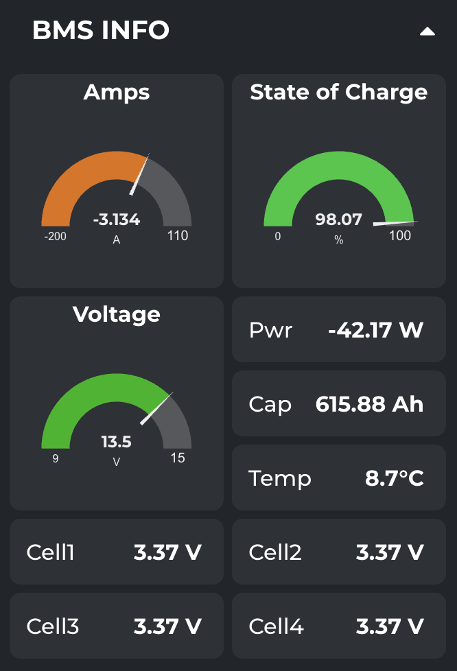 Es kann manchmal etwas dauern, bis die Daten kommen, da das Skript je nach BMS-Typ unterschiedliche Anfragen ausprobiert. Sobald es einmal korrekte Daten erhält, werden diese mehr oder weniger sekündlich aktualisiert (BMS-abhängig).