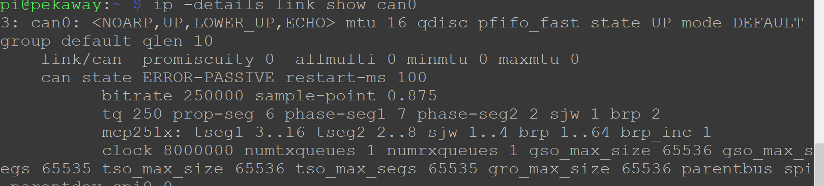 Die Bitrate musst du natürlich entsprechend anpassen. Mit candump can0 in der Konsole solltest du dann die CAN-Frames sehen können.