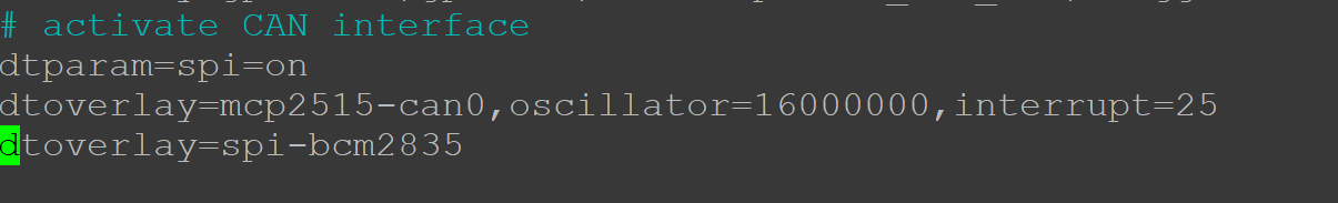 dtoverlay=mcp2515-can0,oscillator=16000000,interrupt=25