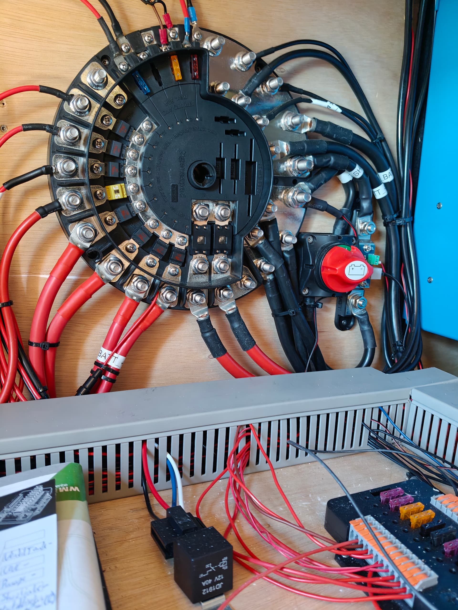 Was man halt nicht sieht sind auf der linken Seite noch drei Solarladeregler (nur zwei davon sind momentan angeschlossen) und einen Ladebooster. Alles Victron.