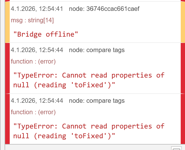 Die Variante mit beiden RuuviTags aktiv (3in1 und 4in1) wirft den Fehler, weil versucht wird die Funktion toFixed() auf “Null” anzuwenden für die 3in1 und damit crasht die Funktion, denn toFixed() kann nur auf Zahlen (“Number”) angewandt werden.