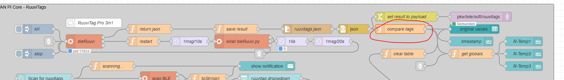 Anschluss von 2*Ruuvitag Pro 4in1, nach den Ergänzungen von “Node:Compare Tags” Bild 1, durch die gelb markierene Zeilen (ohne // Auskommentierung), Anzeige im Dashboard ok