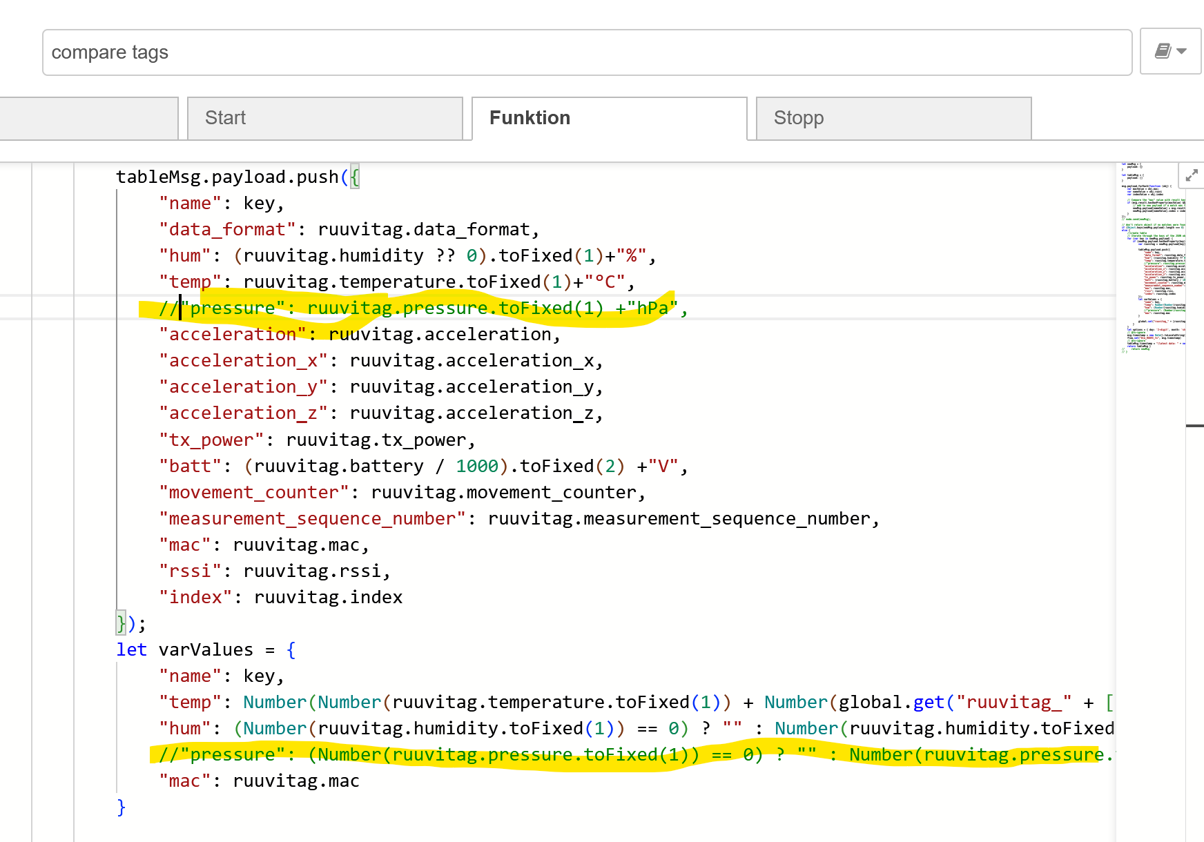 Also in beiden Zeilen: "pressure": (typeof ruuvitag.pressure === "number") ? ruuvitag.pressure.toFixed(1) + "hPa" : "",