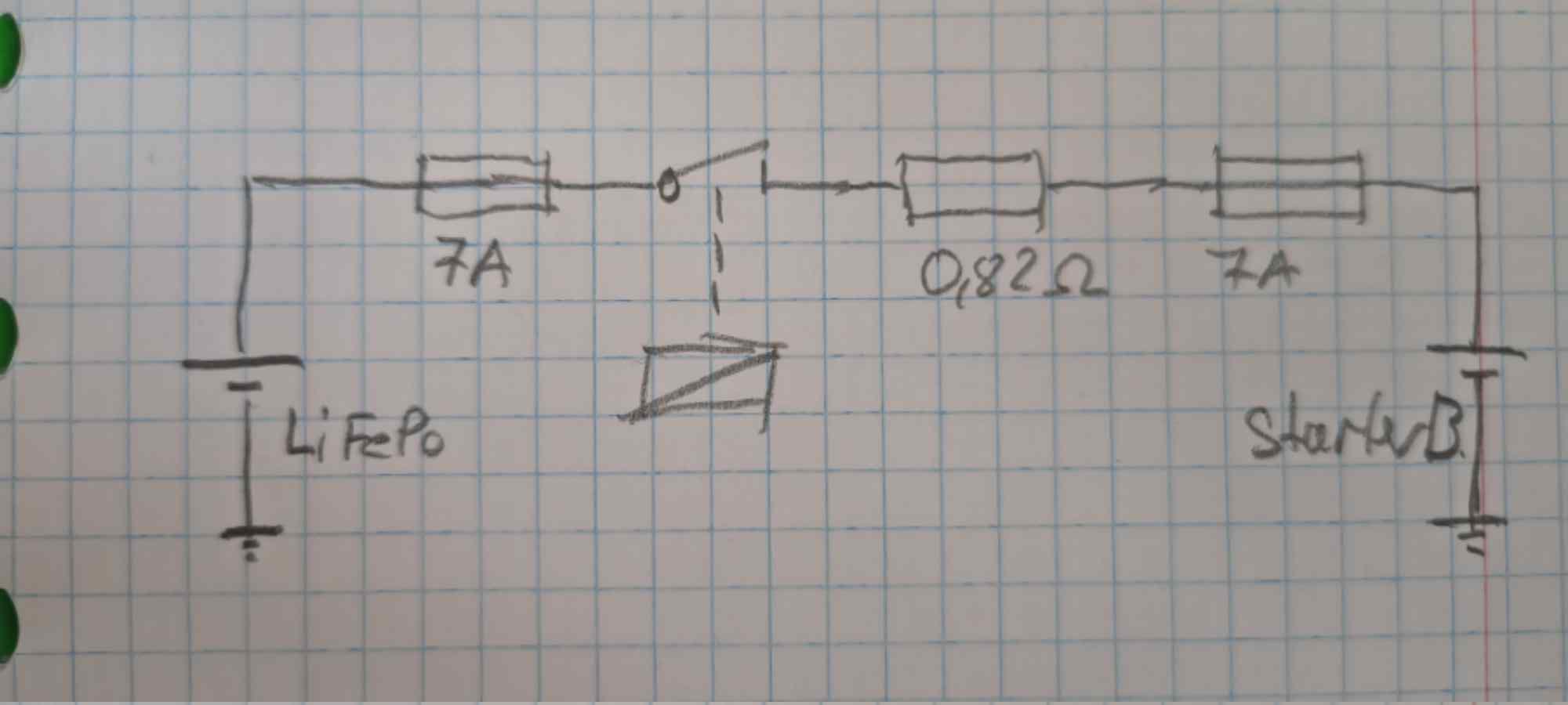 Meine Ladeschaltung ist ganz simpel einfach ein 0,82 Ohm/5Watt Widerstand. Zwischen LiFePo und Starterbatterie abgesichert an jeder Batterie mit 7A geschaltet über ein Relais.
