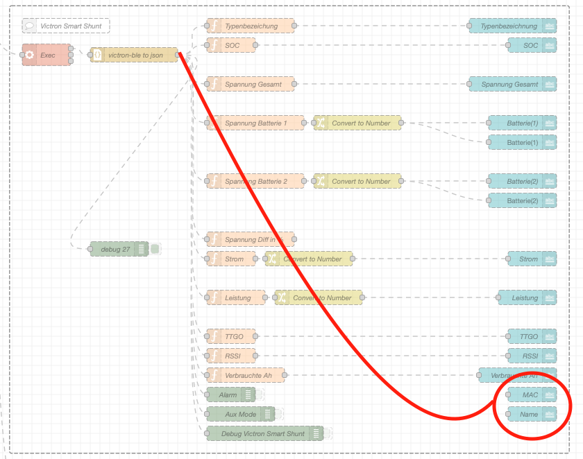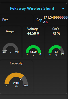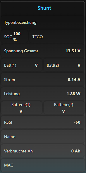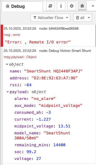 [{"id":"3b7efe18cd531c19","type":"inject","z":"edeb94a459c4553a","name":"","props":[{"p":"payload"},{"p":"topic","vt":"str"}],"repeat":"10","crontab":"","once":true,"onceDelay":0.1,"topic":"","payload":"","payloadType":"date","x":150,"y":40,"wires":[["7b64fe195f2a3970","a0411929543fc4f9","c38dcd2e2cda9c9a"]]},{"id":"bbcf764afa516d23","type":"group","z":"edeb94a459c4553a","style":{"stroke":"#999999","stroke-opacity":"1","fill":"none","fill-opacity":"1","label":true,"label-position":"nw","color":"#a4a4a4"},"nodes":["c38dcd2e2cda9c9a","47e797498ec6a66a","82b2701a3f914d03","daa43575d4a4499b","c17763b87ca98b64","753f5b5ec72f205f","b2e78f06cc0c0ce7","8b70a2f3df2855e2","8d2ad82651280bec","e3dc1025e7b51015","6e96d4c770f3fd42","2913461f2c99fb41","0dec92053f220fee","2d60b751da271662","ab6ffe28f44916b3","c4a509e15e6e6735","752791173add7c32","c229bc8a4dc9b9f4","1dda77cc6db32735","e9c8c0e3e2cf57db","ef01b78d8a188167","61726ac3ce74a942","645ef16a154e2f07","5d5b01e515b3ff5c","c766cc3ebf604bd1","17ca261874f36f24","dbfe319b284daaa9","b854d1eaff378b17","e2b33d726905cee1","542a16698617b34d","0dfd5841996181c4","6d927cbafd5759dc","3e7ef7e7e0f0e43d","cc6ab9e9f6220c4f","915a0149f3a87adb"],"x":314,"y":39,"w":1152,"h":922},{"id":"c38dcd2e2cda9c9a","type":"exec","z":"edeb94a459c4553a","g":"bbcf764afa516d23","command":"sudo timeout -s SIGINT 10s /usr/local/bin/victron-ble read D2:8E:92:63:A7:96@f336b7f5ee4f66ae7fc2b136c06a832d","addpay":false,"append":"","useSpawn":"true","timer":"","winHide":false,"oldrc":false,"name":"Exec","x":390,"y":140,"wires":[["47e797498ec6a66a"],[],[]]},{"id":"47e797498ec6a66a","type":"json","z":"edeb94a459c4553a","g":"bbcf764afa516d23","name":"victron-ble to json","property":"payload","action":"","pretty":false,"x":570,"y":140,"wires":[["82b2701a3f914d03","6e96d4c770f3fd42","2913461f2c99fb41","0dec92053f220fee","2d60b751da271662","ab6ffe28f44916b3","1dda77cc6db32735","c229bc8a4dc9b9f4","752791173add7c32","ef01b78d8a188167","61726ac3ce74a942","c766cc3ebf604bd1","b854d1eaff378b17","e2b33d726905cee1"]]},{"id":"82b2701a3f914d03","type":"debug","z":"edeb94a459c4553a","g":"bbcf764afa516d23","name":"Debug Victron Smart Shunt","active":false,"tosidebar":true,"console":false,"tostatus":false,"complete":"payload","targetType":"msg","statusVal":"","statusType":"auto","x":840,"y":920,"wires":[]},{"id":"daa43575d4a4499b","type":"ui_text","z":"edeb94a459c4553a","g":"bbcf764afa516d23","group":"5bffe643c0265073","order":10,"width":0,"height":0,"name":"Name","label":"Name","format":"{{msg.payload.name}}","layout":"row-spread","className":"","style":false,"font":"","fontSize":"","color":"#000000","x":1390,"y":880,"wires":[]},{"id":"c17763b87ca98b64","type":"ui_text","z":"edeb94a459c4553a","g":"bbcf764afa516d23","group":"5bffe643c0265073","order":7,"width":0,"height":0,"name":"Strom","label":"Strom","format":"{{msg.payload}} A","layout":"row-spread","className":"","style":false,"font":"","fontSize":"","color":"#000000","x":1390,"y":560,"wires":[]},{"id":"753f5b5ec72f205f","type":"ui_text","z":"edeb94a459c4553a","g":"bbcf764afa516d23","group":"5bffe643c0265073","order":8,"width":0,"height":0,"name":"Leistung","label":"Leistung","format":"{{msg.payload}} W","layout":"row-spread","className":"","style":false,"font":"","fontSize":"","color":"#000000","x":1380,"y":640,"wires":[]},{"id":"b2e78f06cc0c0ce7","type":"ui_text","z":"edeb94a459c4553a","g":"bbcf764afa516d23","group":"5bffe643c0265073","order":3,"width":"4","height":"1","name":"TTGO","label":"TTGO","format":"{{msg.payload}}","layout":"row-spread","className":"","style":false,"font":"","fontSize":"","color":"#000000","x":1390,"y":720,"wires":[]},{"id":"8b70a2f3df2855e2","type":"ui_text","z":"edeb94a459c4553a","g":"bbcf764afa516d23","group":"5bffe643c0265073","order":2,"width":"2","height":"1","name":"SOC","label":"SOC","format":"{{msg.payload}} %","layout":"row-spread","className":"","style":false,"font":"","fontSize":"","color":"#000000","x":1390,"y":120,"wires":[]},{"id":"8d2ad82651280bec","type":"ui_text","z":"edeb94a459c4553a","g":"bbcf764afa516d23","group":"5bffe643c0265073","order":12,"width":0,"height":0,"name":"MAC","label":"MAC","format":"{{msg.payload.address}}","layout":"row-spread","className":"","style":false,"font":"","fontSize":16,"color":"#000000","x":1390,"y":840,"wires":[]},{"id":"e3dc1025e7b51015","type":"ui_text","z":"edeb94a459c4553a","g":"bbcf764afa516d23","group":"5bffe643c0265073","order":4,"width":"6","height":"1","name":"Spannung Gesamt","label":"Spannung Gesamt","format":"{{msg.payload}} V","layout":"row-spread","className":"","style":false,"font":"","fontSize":16,"color":"#000000","x":1350,"y":200,"wires":[]},{"id":"6e96d4c770f3fd42","type":"function","z":"edeb94a459c4553a","g":"bbcf764afa516d23","name":"TTGO","func":"const minutes = msg.payload.payload.remaining_mins;\n\nfunction formatTime(minutes) {\n let weeks = Math.floor(minutes / (7 * 24 * 60));\n minutes %= (7 * 24 * 60);\n\n let days = Math.floor(minutes / (24 * 60));\n minutes %= (24 * 60);\n\n let hours = Math.floor(minutes / 60);\n minutes %= 60;\n\n // Construct the time string dynamically\n let result = [];\n if (weeks > 0) result.push(`${weeks} Woche${weeks > 1 ? 's' : ''}`);\n if (days > 0) result.push(`${days} Tag${days > 1 ? 'e' : ''}`);\n if (hours > 0) result.push(`${hours} Stunde${hours > 1 ? 'n' : ''}`);\n if (minutes > 0) result.push(`${minutes} Minute${minutes > 1 ? 's' : ''}`);\n\n return result.join(\", \");\n}\n\nif (minutes == -1) {\n msg.label = \"Time to Full\"\n global.set(\"VE_timetogo\", \"charging\");\n\n // Get values from global context\n let consumedAh = Number(global.get(\"VE_consumedAH\")); // Negative value (e.g., -55.55)\n let chargingCurrentA = Number(global.get(\"VE_Current\")); // Current in Amps\n\n // Prevent division by zero\n if (chargingCurrentA <= 0) {\n msg.payload = \"Not charging\";\n return msg;\n }\n\n // Calculate time in minutes\n let timeToFullMinutes = (consumedAh * -1) / chargingCurrentA / 0.016666666;\n\n // Convert m