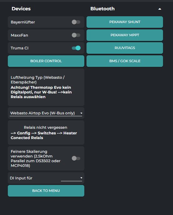 Hab keine Moglichkeit gefunden die Heizung übers Display zu starten, hierfür wie nutze ich den Steuerteil Webasto/generic aus dem Dashboard. Auch aus der App klappt es, aber das Display scheint nur eine Steuermöglichkeit für Autotherm/Truma ? zu bieten. Mit Boiler und Lüftung. Bestimmt ich irgendwo nur nen Haken nicht gesetzt, ich könnte es aber nicht finden.